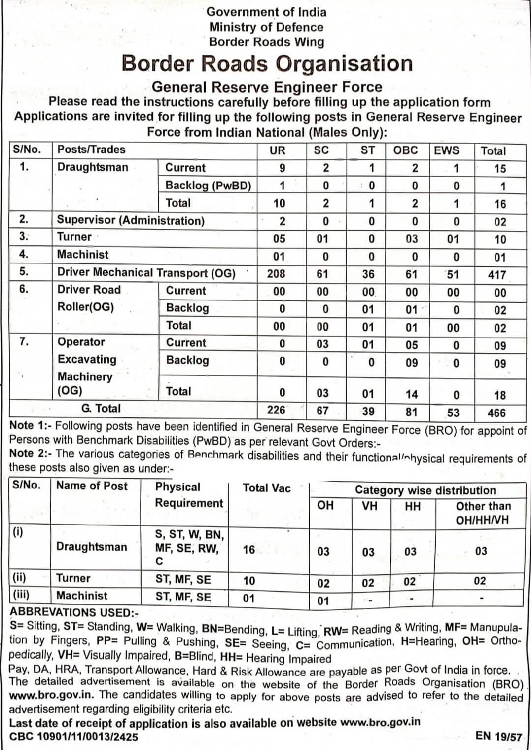 BRO GREF Bharti मध्ये एकूण विविध पदांसाठी 466 जागा रिक्त आहेत. डाफ्ट्समन (16), प्रशासकीय अधिक्षक (02), टर्नर (10), मशिनिस्ट (01), चालक मेकॅनिकल ट्रांन्सपोर्ट (417), ड्रायव्हर रोड रोलर (02) ऑपरेटर (18) या प्रकारे विविध पदांसाठी एवढी जागा आहेत.
